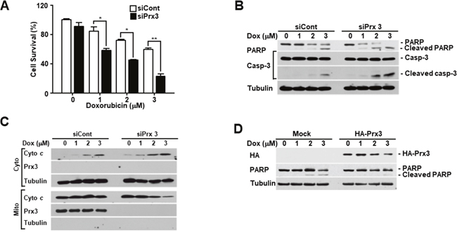 Figure 3: Prx3 regulates doxorubicin-induced cell death in EC cells. (A-C) Ishikawa cells transfected with siRNA against Prx3 or control siRNA, and treated with the indicated dose of doxorubicin for 24 hours. (A) Doxorubicin-induced cell death measured using FACSCantoII analysis, after staining using an annexin V-fluorescein isothiocyanate (FITC)/7-amino actinomycin D (7-AAD) staining kit. (B) Western blotting (with the indicated antibodies) of Prx3-depleted cells, treated with doxorubicin at the indicated doses. (C) Western blotting of cells transfected with siCont/siPrx3, treated with doxorubicin for 24 hours, and separated into cytosolic and mitochondrial fractions. Tubulin and Prx3 antibodies are used as markers of the cytosolic and mitochondrial fractions, respectively, and cytochrome c is used to indicate mitochondrial-mediated cell death. (D) Poly ADP-ribose polymerase and tubulin levels in Ishikawa cells transfected with pHA-Prx3 or Mock plasmid, followed by treatment with doxorubicin for 24 hours at the indicated dose.
