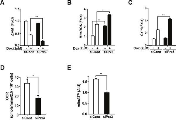Figure 4: Prx3 knockdown regulates mitochondrial activity in EC cells. (A-C) Ishikawa cells transfected with siPrx3 or siCont for 48 hours, and then treated with doxorubicin or vehicle for 24 hours. Mitochondrial membrane potential (A), mitochondrial ROS levels (B), and calcium levels (C) measured using FACSCantoII analysis, after staining with TMRE, Mito-Sox, and Rhod-2AM. (D and E) Ishikawa cells transfected with siRNA against Prx3 or siCont; OCR (D) and mitochondrial ATP levels (E).