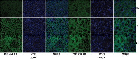 Figure 2: MiR-30c-5p was elevated in the ischemia/reperfusion animal model. In situ hybridization was performed to examine miR-30c-5p expression in the kidney cortex. MiR-30c-5p was detected in renal tubular and tubule-interstitial cells 6 h post operation and increased at 24 h after operation.