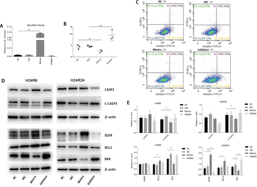 Figure 3: MiR-30c-5p reduced apoptosis and promoted proliferation in cellular H/R injury. (A) The oligos were transfected into HK2 cells. MiR-30c-5p levels were increased significantly in the cells transfected with the mimics, whereas their levels were not altered in inhibitor-transfected cells. (B-C) Flow cytometry was conducted to detect apoptosis in the H/R model. The apoptosis levels decreased significantly in the mimics group compared with the control group and increased significantly in the inhibitor group compared with the control group. (D) The protein levels of CASP3, Cleaved-CASP3, EGFR, BCL2, BAX were analyzed in the H/R model while the miR-30c-5p was up-/down-regulated. β-actin was used as the internal control. (E) Density levels were analyzed using ImageJ, and the histograms show the average values corrected to β-actin. The data are expressed as the mean±S.E.M, n=3, *P<0.05, **P<0.01 compared with the control group.
