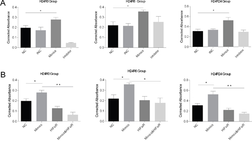 Figure 4: Cell proliferation levels were detected using the CCK-8 assay at 0-, 6- and 24-h time points during cellular H/R injuries (the histograms show corrected absorbances). (A) Cell proliferation was promoted in the mimics group and showed no changes in the inhibitor group at 6 h and 24 h. (B) Cell proliferation was promoted in the mimics group and was inhibited in the HIFsiR and the Mimics&HIFsiR groups. The data are expressed as the mean±S.E.M, n=3, *P<0.05, **P<0.01 compared with the control group. The Mimics&HIFsiR group was co-transfected with both the mimics and the HIF1α-siRNA.