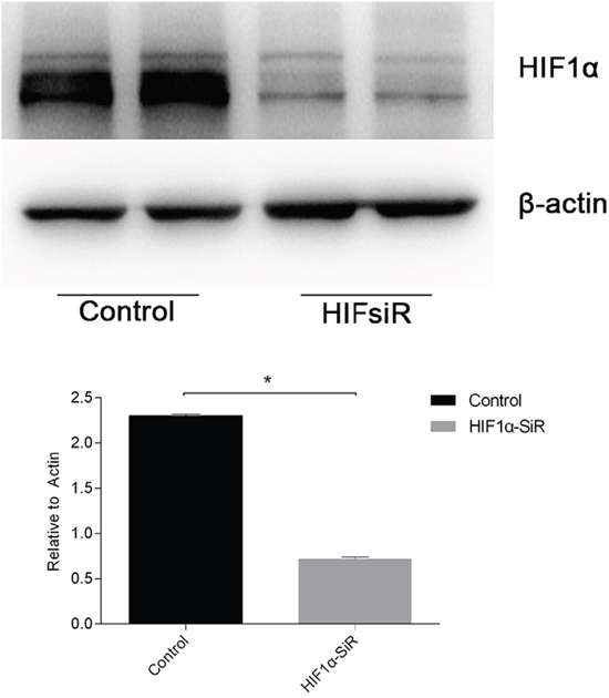 Figure 6: The knockdown efficiency of HIF1α-siRNA was evaluated. HIF1α expression levels (protein levels are shown in the top panel and the mRNA levels on the bottom panel) declined sharply in cells that were transfected with HIF1α-siRNA. The data are expressed as the mean±S.E.M, n=3, *P<0.05, compared with the control group.