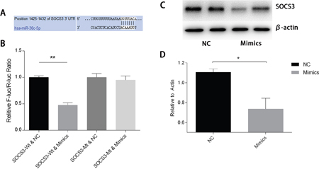 Figure 8: MiR-30c-5p targets the SOCS3 3’UTR to reduce its expression. (A) Bioinformatics analysis of the predicted interactions between miR-30c-5p and 3’UTR of SOCS3. (B) Dual luciferase reporter assay was conducted to demonstrate the interactions between the two. Overexpression of miR-30c-5p diminished fluorescence when the cells were transfected with a wild-type SOCS3-3’UTR vector. (C-D) Protein levels of SOCS3 decreased significantly in the miR-30c-5p-overexpression group. The data are expressed as the mean±S.E.M, n=3, *P<0.05, **P<0.01 compared with the control group. SOCS3, suppressor of cytokine signaling-3; SOCS3-WT, wild-type SOCS3-3’UTR vector; SOCS3-MT, mutant-type SOCS3-3’UTR vector.