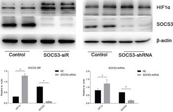 Figure 9: HIF1α expression levels were enhanced when SOCS3 was inhibited. siRNA and shRNA were used to inhibit SOCS3. The data are expressed as the mean±S.E.M, n=3, *P<0.05, compared with the control group.