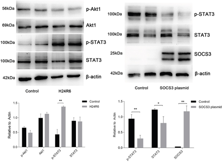 Figure 11: STAT3 was activated in response to cellular H/R injury and was inhibited in cells overexpressing SOCS3. (Left) Protein levels of STAT3, p-STAT3, Akt and p-Akt were analyzed in the H/R model. (Right) Protein levels of STAT3 and p-STAT3 were analyzed in SOCS3 overexpression group. β-Actin was used as the internal control. The data are expressed as the mean±S.E.M, n=3, *P<0.05, **P<0.01 compared with the control group.