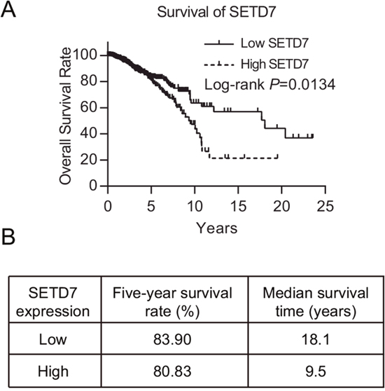 Breast cancer has been expected to be the most common cancer diagnosed in the United States in 2016, accounting for 29% of all new cancer diagnoses in women [19]. Five-year survival rate of breast cancer is around 85.4%-91.4% according to the race and ethnicity of the patient [20]. Various markers have been reported to predict the prognosis of breast cancer. However, the prognostic value of monomethyltransferase SETD7 has never been explored. Here in this study, we explored the data of breast cancer from TCGA database and we demonstrated the relationship between SETD7 and poor outcome of breast cancer patients.