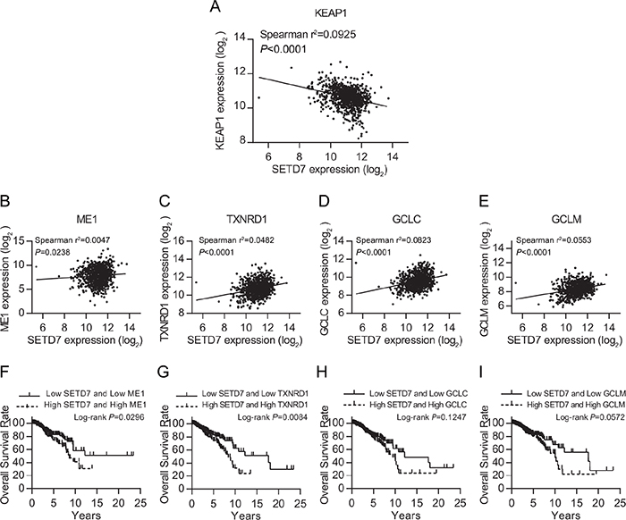 Figure 2: SETD7 is tightly correlated with KEAP1-NRF2 pathway. (A) Negative correlation between SETD7 and KEAP1. (B-E) Positive correlation between SETD7 and NRF2 target genes. (F-I) SETD7 predicted breast cancer survival together with NRF2 target genes.