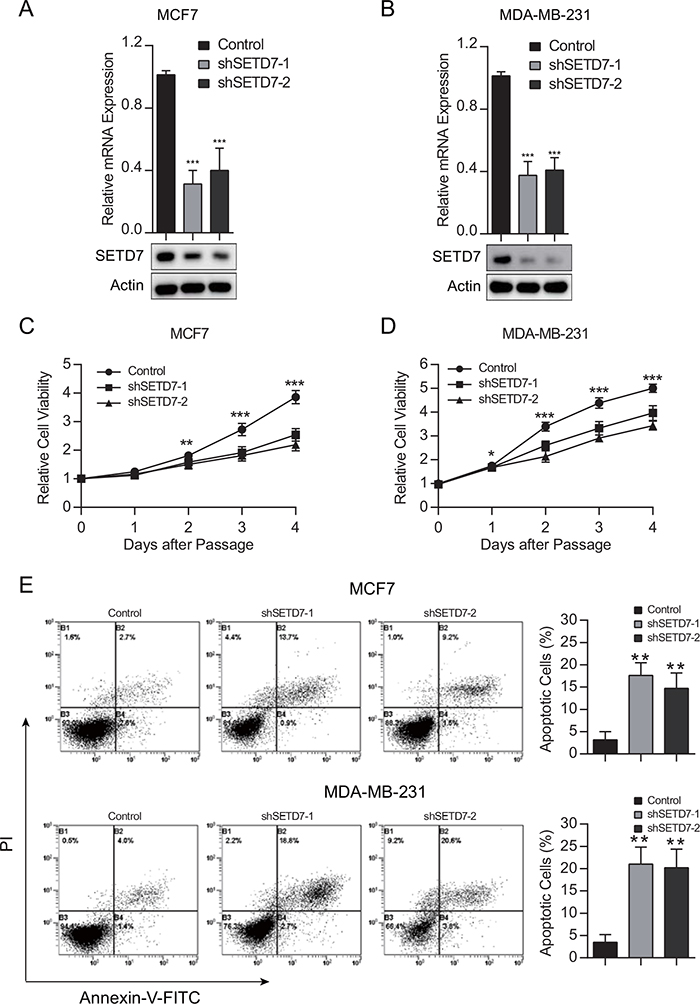 Figure 3: SETD7 promotes cell growth and survival. (A and B) Knockdown efficiency of SETD7, proved by quantitative real-time PCR and western blot analysis. (C and D) Cell viability was measured in breast cancer cells with depleted SETD7 expression (n=6). (E and F) Cell were stained with Annexin V–FITC and PI and analyzed by flow cytometry (n=3). Augmented apoptotic effect was observed in the upper right and lower right quadrants when SETD7 was knocked down. *P< 0.05, **P< 0.01, and ***P< 0.001. All experiments were repeated twice.