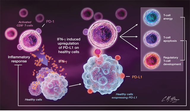 Figure 2: PD-1 is constitutively expressed on activated T cells, B cells, and other myeloid cells. Release of IFN-γ by activated T lymphocytes during inflammatory responses directly induces local PD-L1 expression on surrounding cells. Binding of PD-L1 to lymphocyte-expressed PD-1 transmits an inhibitory feedback signal that suppresses T cell proliferation and cytokine release and induces T cell anergy, apoptosis, and the development of regulatory T cells, thereby attenuating inflammatory responses.