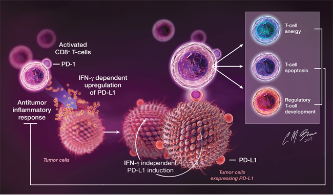 Figure 3: In the setting of cancer, PD-L1 is upregulated on tumor cells in response to IFN-γ released by infiltrating immune cells during antitumor immune responses, as well as through tumor-specific IFN-γ-independent mechanisms. PD-L1 serves as a receptor on cancer cells that, through interactions with PD-1expressing TIL, induces an intrinsic resistance to CTL killing and suppresses antitumor immune responses.