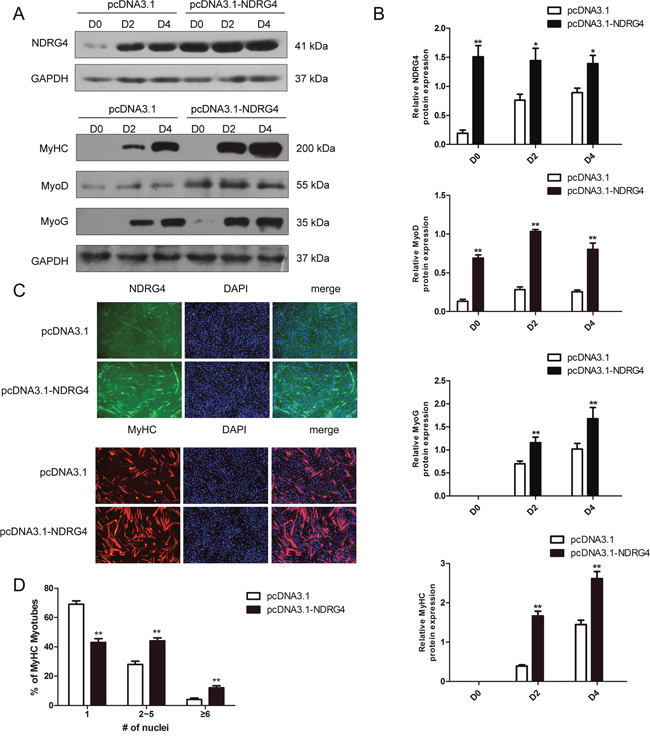 To confirm the above results, C2C12 myoblasts were transfected with control or NDRG4 expression vectors and induced to differentiate. Total protein was extracted at D0, D2, and D4. The expression level of NDRG4 was significantly increased with overexpression, and the expression of myogenic marker genes, including MyoD, MyoG, and MyHC, was significantly enhanced in NDRG4-overexpressing C2C12 myoblasts compared to the control (Figure 4A and 4B). Next, we examined the effect of NDRG4 overexpression on myotube formation. Control and NDRG4-overexpressing C2C12 cells were induced to differentiate for 3 days and stained with anti-MyHC antibody followed by 4’,6-diamidino-2-phenylindole (DAPI) staining. NDRG4-overexpressing C2C12 cells formed larger and more numerous myotubes than control (pcDNA3.1) cells (Figure 4C and 4D). These data suggest that NDRG4 promotes myoblast differentiation.