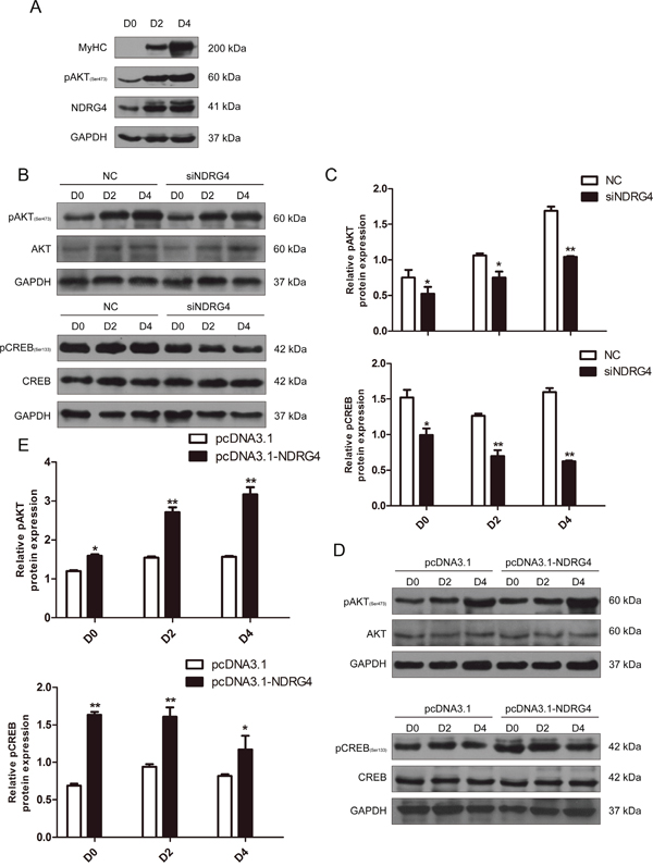 Figure 5: NDRG4 activates the Akt/CREB pathway during myoblast differentiation. (A) Western blot results of NDRG4 and pAkt protein expression levels in C2C12 cells at differentiation days 0, 2, and 4. MyoG and MyHC are two known markers of muscle differentiation. (B) Western blot results of pAkt, Akt, pCREB, and CREB protein expression levels in C2C12 cells transfected with siNDRG4. (C) Relative protein expression levels of pAkt and pCREB after NDRG4 knockdown in C2C12 cells at D0, D2, and D4. (D) Western blot results showing the changes in pAkt, Akt, pCREB, and CREB protein expression levels in C2C12 cells transfected with NDRG4 plasmids. (E) Relative protein levels of pAkt and pCREB after NDRG4 overexpression at D0, D2, and D4. *P < 0.05; **P < 0.01.