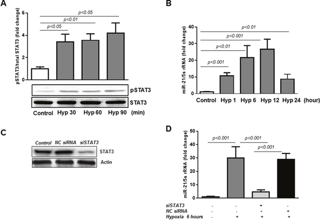 Figure 1: miR-21 is a down-stream target of STAT3 in HREC in hypoxia. (A) STAT3 is activated by hypoxia in HREC. Western blotting analysis showing phosphorylation of STAT3 at tyrosine 705 in HREC exposed to hypoxia (pO2=2%) for 30-90 min. Blots were subjected to densitometry analysis and the obtained data were analyzed for statistical significance. (B) MiR-21 is up-regulated in HREC in hypoxia. QPCR analysis demonstrating miR-21 expression in HREC exposed to hypoxia (pO2=2%) for 1-12 hours. (C) STAT3 protein expression by Western blot showing that STAT3 siRNA (50 nM final concentration), but not NC siRNA, decreased total STAT3 protein in HREC by ~70% assessed 48 hours after transfection. (D) Blocking of STAT3 down-regulates miR-21 expression in hypoxia. QPCR showing miR-21 expression in HREC transfected with siRNA constructs for STAT3 and NC siRNA and exposed to hypoxia (pO2=2%) for 6 hours. Values are mean ± SD of four separate experiments.