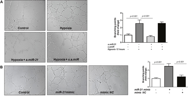 Figure 2: Matrigel tube formation assay in HREC. (A) Representative images of tube formation and quantification of branching points in HREC transfected with a.miR-21 (50 nM final concentration) and s.amiR and exposed to hypoxia (pO2=2%) for 12 hours. (B) Representative images of tube formation and quantification of branching points in HREC transfected with miR-21 mimic (50 nM) or mimic NC for 48 hours (B). Tube formation was observed under an inverted microscope and the images were captured with a digital camera. Representative images and analysis of three independent experiments. Original magnification, x10.