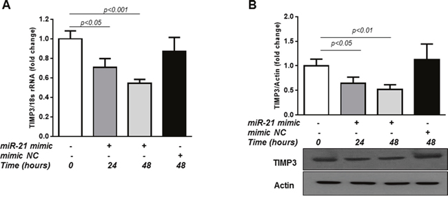 Figure 4: Overexpression of miR-21 up-regulates TIMP3 expression in HREC. (A) QPCR of TIMP3 mRNA expression in control HREC and HREC transfected with miR-21 mimic (50 nM) for 24 and 48 hours or mimic NC. (B) Western blot showing expression of TIMP3 in HREC transfected with miR-21 mimic or mimic NC. Values are mean ± SD of four separate experiments.