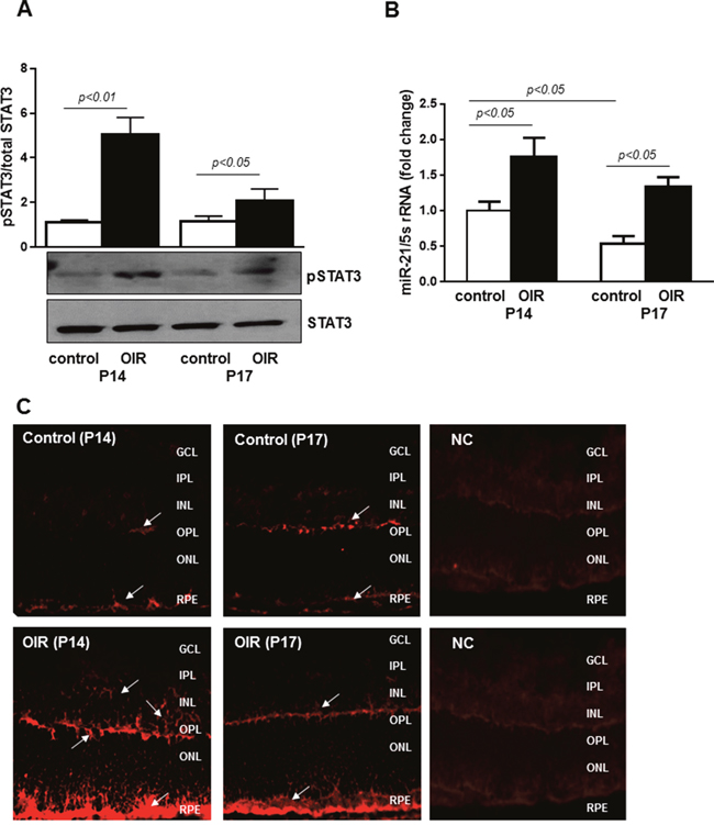 Figure 5: STAT3 and miR-21 are activated in retinas of OIR mice. (A) Western blotting analysis showing phosphorylation of STAT3 at tyrosine 705 in retinas of control and OIR mice at P14 and P17. Blots were subjected to densitometry analysis and the obtained data were analyzed for statistical significance. (B) QPCR analysis demonstrating miR-21 expression in retinas of control and OIR mice at P14 and P17. Values are mean ± SD (n=5 retinas per group). (C) Representative images of miR-21 ISH in retinas from OIR (lower images) and control (upper images) mice at P14 and P17 (n=4 retinas per group). Arrows indicate expression of miR-21 in the INL, OPL, and RPE cell layers. Original magnification, x20.