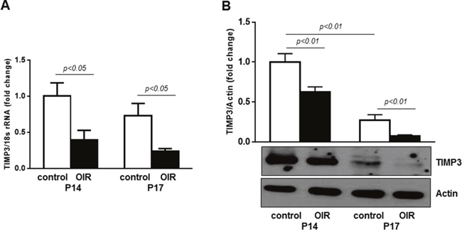 Next, we assessed the expression of TIMP3 in retinas of control mice and mice following OIR by qPCR and immunoblotting analyses. Figure 6A shows that retinal TIMP3 mRNA expression was significantly down-regulated in OIR mice at postnatal days P14 and P17 compared to control mice of the same age (~2.5 and 3.1 fold at P14 and P17, respectively). The decrease in TIMP3 mRNA expression was followed by reduction in TIMP3 protein as shown in Figure 6B (p<0.01 vs respective control mice).