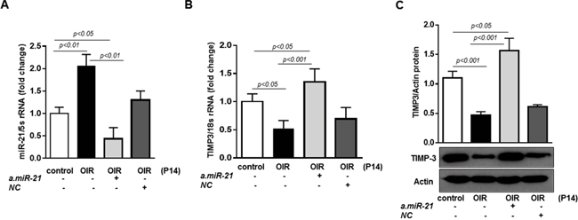 Figure 7: Intraorbital delivery of miR-21 inhibitor recovers TIMP3 expression in retinas of OIR mice. (A) MiR-21 expression in retinas of control mice and OIR mice at P14 injected with miR-21 inhibitor (a.miR-21) or NC LNA. (B) QPCR of TIMP3 mRNA expression in retinas of control mice and OIR mice at P14 injected with a.miR-21 or NC LNA. (C) Western blot showing expression of TIMP3 in retinas of control mice and OIR mice at P14 injected with a.miR-21 or NC LNA. Blots were subjected to densitometry analysis and the obtained data were analyzed for statistical significance. Values are mean ± SD (n=5 retinas per group).