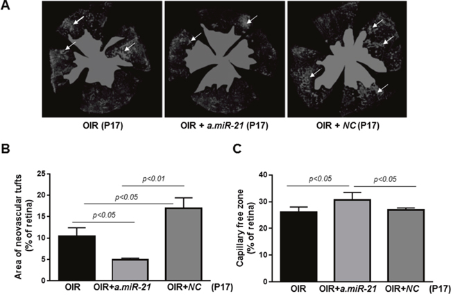 All the animal procedures were performed in accordance with the statement of the Association for Research in Vision and Ophthalmology (ARVO) for the humane use of animals in vision science and with protocols approved by Augusta University (AU). C57Bl/6J mice were purchased from Jackson laboratories (Bar Harbour, ME) at 2 months of age and kept in AU animal facility with a light cycle of 12 hours and fed ad libitum. RNV was induced in a mouse model of OIR according to the protocol of Smith et al. [63]. In this model, on postnatal day 7 (P7), newborn mice are placed, along with their dam, into a custom-built chamber in which the partial pressure of oxygen is maintained at 75%. After 5 days, the mice are brought to room air and kept until P17. In this model, neo-vascularization forms from P13 through P17 in response to hypoxic conditions in the retina and is quantified at P17, when pathological response is at a maximum. Age-matched C57Bl/6J mice kept at room air are used as controls. To block miR-21, OIR mice received at P11, while still in the oxygen chamber, intraorbital injections of 1 μl of seed-targeting miRCURY Locked Nucleic Acid (LNA) inhibitor (a.miR-21; mmu-miR-21a-5p; Exiqon, Woburn, MA) or LNA inhibitor control (NC; Exiqon) in the left eye (3 μg each). The mice were sacrificed by an overdose of anesthetic at P14 and P17. The eyeballs and retinas were excised and processed for imaging or molecular analysis. 2-3 sets of six pups each were used for each treatment group.