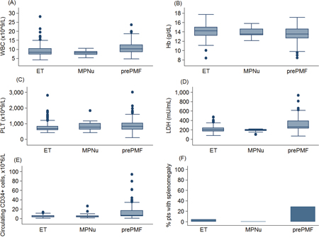 Figure 1: Main hematologic parameters in patients with essential thrombocythemia and prefibrotic myelofibrosis diagnosed according to the new 2016 WHO criteria. Data are shown in a box plot depicting the upper and lower adjacent values (highest and lowest horizontal line, respectively), upper and lower quartile with median value (box), and outside values (dots). The figure shows (A) leukocyte count (WBC), (B) hemoglobin (Hb), (C) platelet count (PLT), (D) lactate dehydrogenase level (LDH), (E) circulating CD34-positive cells, (F) the percentage of patients with splenomegaly.