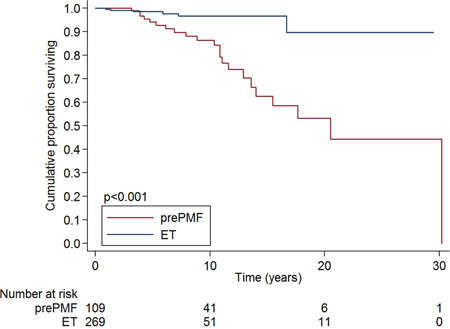 Figure 2: Overall survival of patients with essential thrombocythemia and prefibrotic myelofibrosis diagnosed according to the new 2016 WHO criteria. ET patients had a better overall survival than prePMF patients (overall survival at 10-years 96·6% vs 86·4%, P <·001).