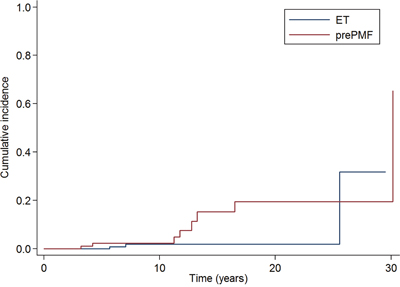 Figure 3: Cumulative incidence of leukemic evolution in patients with essential thrombocythemia and prefibrotic myelofibrosis diagnosed according to the new 2016 WHO criteria. The 10-years cumulative incidence of leukemia was 2·3% (95% CI: 0·4-7·3%) in prePMF and 1·9% (95% CI: 0·4-6%) in ET, with a trend (P ·067) to a higher risk of leukemic evolution in prePMF.