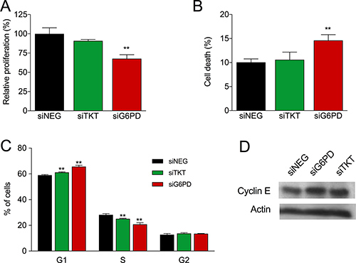 Figure 2: Role of PPP enzymes TKT and G6PD in cell proliferation, survival and cell cycle. (A) Effect of TKT and G6PD silencing on proliferation six days after transfection expressed as percentage of siNEG. (B) Effect of TKT and G6PD silencing on cell death six days after transfection (percentage of PI-positive cells). Bars in A and B represent mean (n = 2) ± SEM for TKT and mean (n = 5) ± SEM for G6PD. (C) Effect of TKT and G6PD silencing on cell cycle progression five days after siRNA transfection. The percentages of cells in each phase are depicted as mean (n = 3) ± SD. (D) Cyclin E and β-actin (loading control) protein levels were analyzed four days after siRNA transfection.