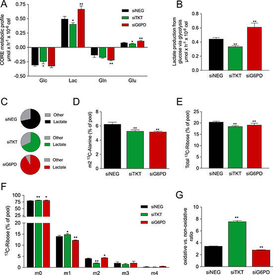 Figure 3: Metabolic effects of TKT and G6PD silencing. [13C]-assisted metabolomics experiment was performed by replacing culture media by fresh media containing 50% of [1,2-13C2]-glucose four days after siRNA transfection. Cells were incubated with the tracer for 24h and extracellular fluxes and isotopologue distribution of different metabolites were determined. (A) CORE (consumption and release) metabolic profile showing rates of consumption of glucose (Glc) and glutamine (Gln) and release of lactate (Lac) and glutamate (Glu). (B) Flux of production of lactate from glucose via glycolysis. (C) Proportion of consumed glucose dedicated to either production of lactate or other uses. (D) Levels of m2 13C-alanine in media. (E) Total 13C-labeled ribose from RNA. (F) Isotopologue distribution of ribose from RNA. (G) Ratio of m1 13C-ribose to m2 13C-ribose as an indicator of the oxidative vs. non-oxidative PPP activity. In all cases values represent mean (n = 3) ± SD.