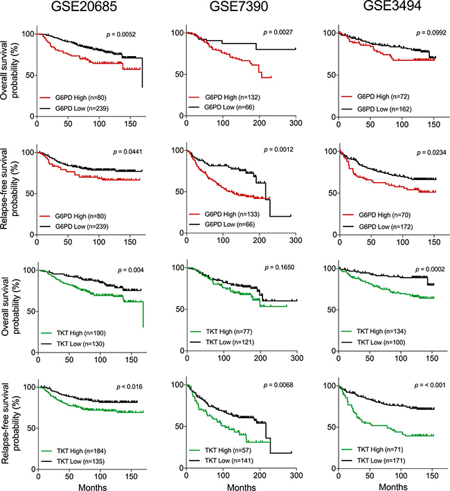 Figure 5: Survival analysis of breast cancer patients associated to the expression of TKT and G6PD. Kaplan–Meier survival analysis showing relapse-free and overall survival for breast cancer patients with high and low expression levels of G6PD or TKT in three independent datasets. p-values of log-rank test are depicted in each plot.