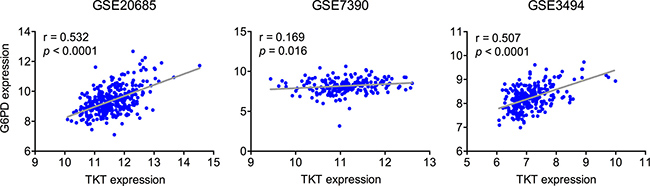 Figure 6: Gene expression correlation analyses. Pearson’s correlation analysis showing gene expression levels of TKT and G6PD in breast cancer patients from three independent datasets. Pearson’s correlation coefficient (r) and p-values are shown for each analysis.