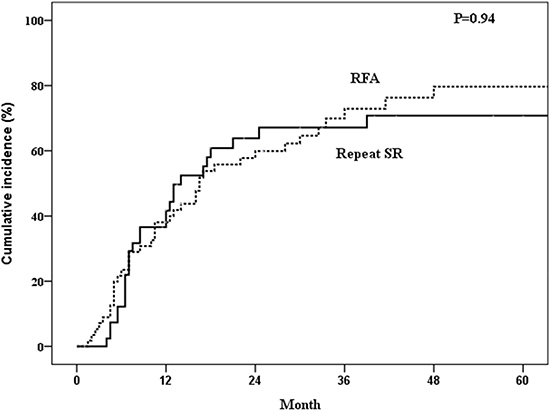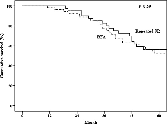 In our study, both repeated SR and RFA completely eliminated recurrent HCC and achieved near 100% response rates. However, a second recurrence of HCC is not uncommon. Chan et al [28] showed 72.4% of patients in the repeated SR group and 84.4% of patients in the RFA group developed a second recurrence with a similar median time from treatment of the first recurrence to second recurrence (6.3 vs. 9.5 months, p = 0.25). Our study showed 79.8% of patients in the repeated SR group and 71.9% of patients in the RFA group developed a second recurrence with a similar median time from treatment of the first recurrence to second recurrence (11 vs. 10 months, p = 0.74).