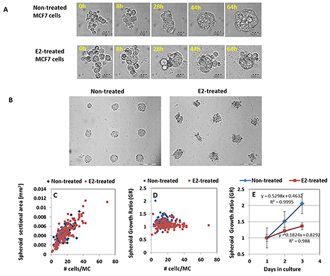 Figure 2: Generation and culturing of 3D multicellular MCF7 BC spheroids within HMC. (A) kinetics of spheroid formation process from non-treated MCF7 cells (upper panel) and E2-treated (lower panel) cells. Cells were seeded within representative MCs in HMC and allowed to generate multicellular structures. Scale bar = 20μm. (B) Bright field images of representative 2-day BC spheroids generated within HMC array from non-treated and E2-treated MCF7 cells. Scale bar = 200μm. (C) Correlation between number of cells per microchamber and sectional area of spheroids at day 2. (D) Correlation between number of cells per microchamber and the growth rate of the corresponding spheroids. Each dot represents an individual spheroid. (E) Growth curves of MCF7 spheroid phenotypes within HMC array. Results represent mean ± SD (N=150).