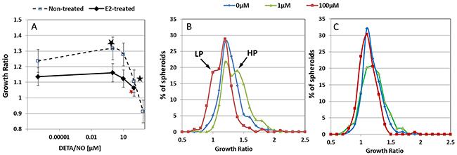 Figure 3: The effect of NO on spheroid growth. (A) Dose response curve of the impact of DETA/NO on spheroid growth. Asterisks represent statistically significant differences from 0μM NO donor. Distribution histograms of MCF7 spheroid GR before (B) and after E2 treatment (C) upon incubation with DETA/NO at 1μM and 100μM. Arrows represent high (HP) and low (LP) proliferating subgroups, correspondingly.