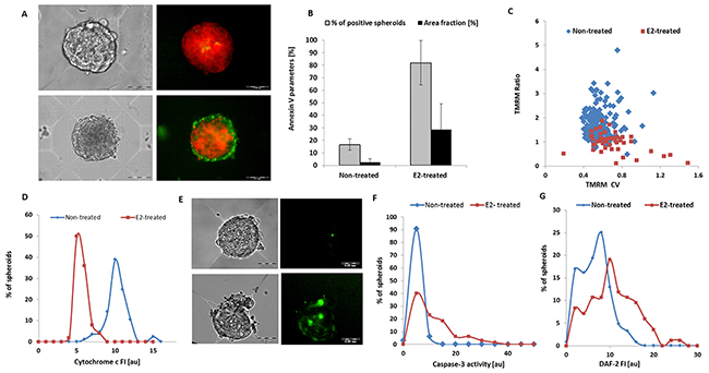 As expected, Annexin V results showed a high level of early apoptosis in MCF7 spheroids exposed to E2. The proportion of Annexin V-positive spheroids and averaged area fraction of the fluorescent signal are significantly higher in this spheroid population (Figure 4B).