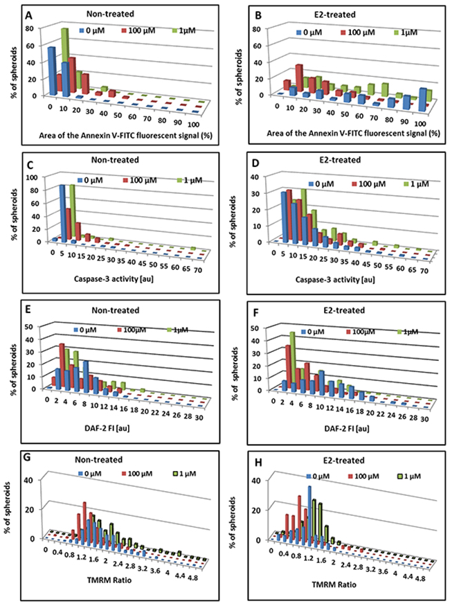 Figure 5: Effect of exogenous NO on apoptotic parameters of MCF7 BC spheroids. Distribution histograms of Annexin V fractional area (A,B) caspase-3 activity (C,D), relative DAF-2 FI (E,F) and TMRM Ratio (G,H) in individual MCF7 3D structures upon 24h incubation with DETA/NO. A,C,E,G – spheroids generated from hormone-deprived cells. B,D,F,H – those derived from E2-treated spheroids.