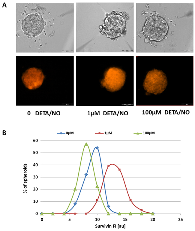Figure 6: Expression levels of survivin in hormone treated BC spheroids. (A) Bright field (upper panel) and corresponding fluorescence images (lower panel) of representative E2-treated spheroids upon 24h exposure to 1μM and 100μM NO donor, following fixation and immune-staining for survivin. Scale bar = 50μm. (B) Distribution histograms of survivin expression levels in E2-treated individual 3D structures upon 24h incubation with DETA/NO.