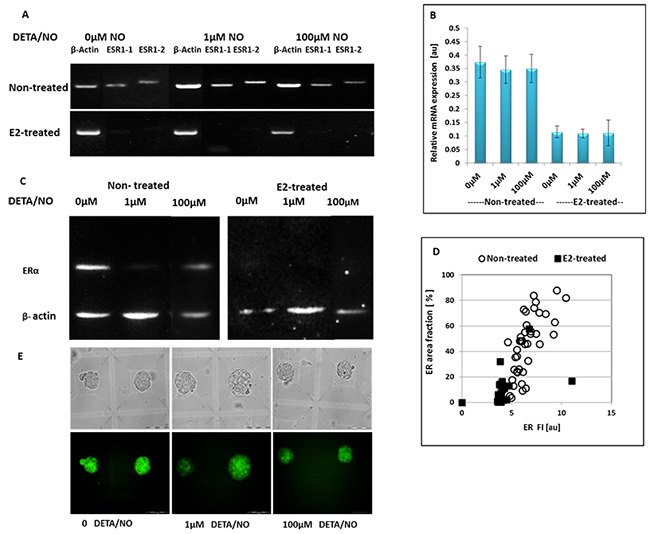 Figure 7: The effect of NO-donor on ER status in hormone-deprived and E2-treated MCF7 spheroids. (A) Gel visualization of the PCR products. (B) Relative mRNA expression levels of ER, calculated as density of the product of ESR1 divided by that of the β-actin from the same cDNA. Bars represent SE of 3 experiments. (C) Relative protein expression levels of ER protein. (D) Fluorescence parameters of ER staining in individual MCF7 spheroids generated from E2-treated (solid squares) and non-treated cells (hollow circles). (E) Bright field (upper panel) and corresponding fluorescence images (lower panel) of two representative spheroids generated in adjacent MCs before and after 24h incubation in the presence of 1μM and 100μM DETA/NO. Scale bar = 100μm.