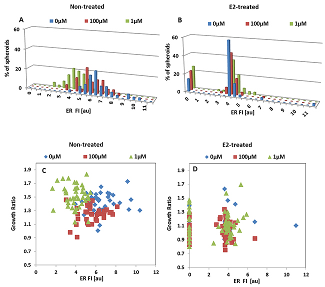 Once established, the growth rate of spheroids from non-treated cells was significantly higher than that of MCF7 cell clusters originated from E2-treated cells (Figure 2E). As seen, during the second day in culture, the mean size of non-treated spheroid populations increased by 23%, while E2-treated clusters increased by only 13%. Overall, the rate of size increase during 3 days in culture was almost three times higher in cancer spheroids grown in the absence of E2 than in clusters cultured in E2-supplemented medium. The corresponding doubling time of the cluster cells were 31h and 23h for hormone-treated and non-treated 3D structures, respectively. Hence, the E2-treated spheroid phenotype displays bigger cell size and proliferates at a slower rate.