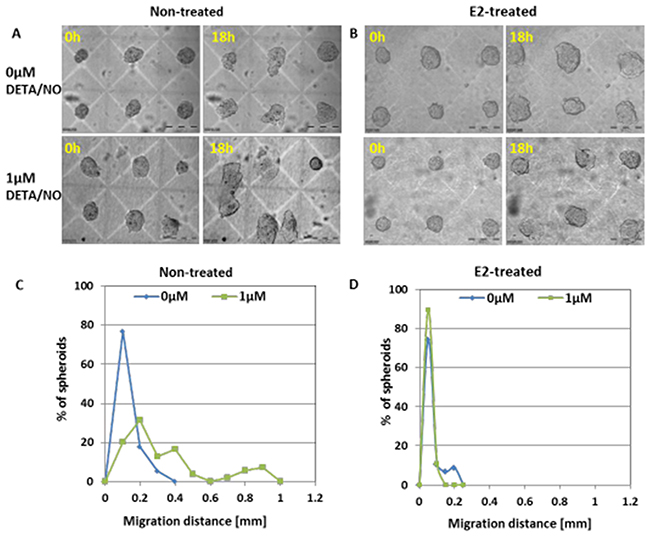 Figure 9: Invasion capacity of MCF7 BC spheroids. Changes in morphology and location of representative non-treated (A) and E2-treated (B) 2-day BC spheroids embedded within collagen matrix and cultured for 18h in the presence and in the absence of 1μM DETA/NO. Scale bar = 200μm. Distribution histograms of the averaged migration distance of hormone-deprived (C) and E2-treated (D) BC spheroids over an 18h period in collagen matrix in the presence and in the absence of 1μM DETA/NO.