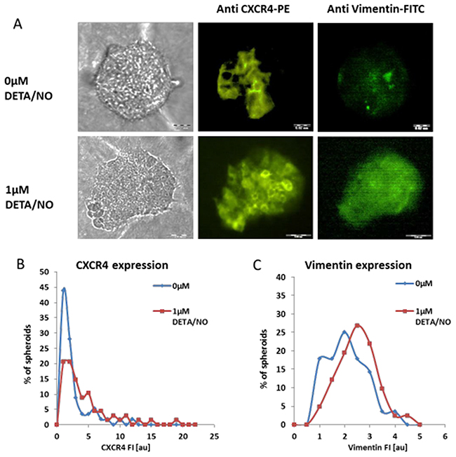 Figure 10: Expression levels of cellular proteins upon NO-induced migration. Hormone deprived BC spheroids were embedded within collagen matrix and cultured for 24h in the absence (upper panel) and in the presence (lower panel) of 1μM DETA/NO. Then, live spheroids were stained by anti CXCR4 Abs, followed by fixation, permeabilization and additional staining by anti-vimentin Abs. (A) Bright field and corresponding fluorescence images of representative 2-day BC spheroids double stained for CXCR4 and vimentin are shown. Scale bar = 200μm. Distribution histograms of CXCR4 (B) and vimentin (C) expression levels in individual hormone deprived MCF7 3D structures upon 24h exposure to DETA/NO.