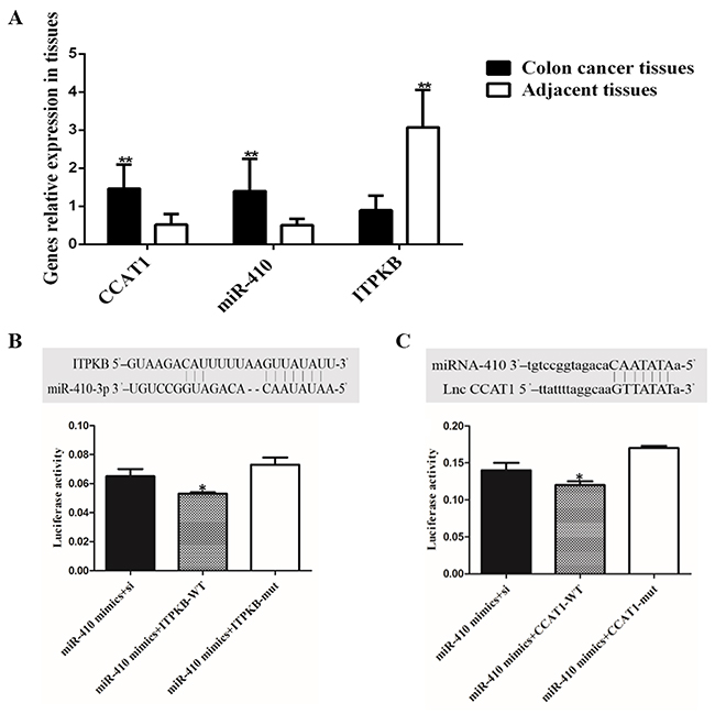 Figure 1: Relative expression of genes mRNA in colon cancer tissue and target genes of miR-410 validation. (A) miR-410, CCAT1 and ITPKB mRNA in colon cancer tissues and adjacent part; (B) Binding site and binding capacity between miR-410 and ITPKB; (C) Target site and luciferase activity were analyzed for relationship between miR-410 and CCAT1. *p<0.05 was a significantly different; **p<0.01, the difference was extremely significant.