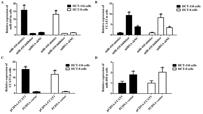 Figure 2: Interaction between miR-410 and lnc CCAT1. (A-B) miR-410 mimics, inhibitor and miR-shNC were transfected into HCT-116/HCT-8 cells, then CCAT1 were analyzed by qPCR. (C-D) Effect of CCAT1 on miR-410 were analyzed in HCT-116/HCT-8 cells. *p<0.05 was a significantly different; **p <0.01, the difference was extremely significant.