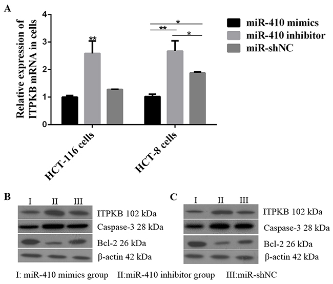 Figure 3: Effects of miR-410 on ITPKB and apoptosis factors in HCT-116/HCT-8 cells. (A) ITPKB mRNA expression levels detected by qPCR after miR-410 mimics or miR-410 inhibitor or miR-shNC transfecting into HCT-116/HCT-8 cells. (B) ITPKB and apoptosis factors proteins were detected in HCT-116 cells. (C) miR-410 mimics or miR-410 inhibitor or miR-shNC transfected into HCT-8 cells, then ITPKB and apoptosis factors proteins were detected by western blot. *p<0.05 was a significantly different; **p<0.01, the difference was extremely significant.