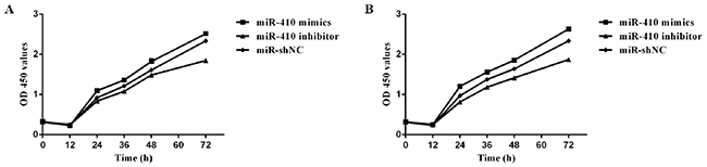 Figure 4: HCT-116/HCT-8 cell proliferation ability. (A) HCT-116 cell growth rate counted after transfection. (B) Growth rate were detected in HCT-8 cells transfected miR-410 mimics, inhibitor and miR-shNC.