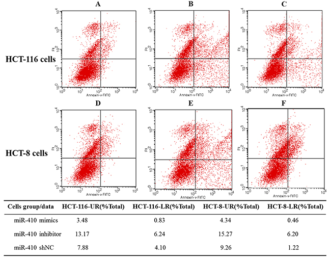 Figure 5: HCT-116/HCT-8 cell apoptosis rate. (A-C) HCT-116 cells transfected miR-410 mimics, inhibitor and miR-shNC, then apoptosis rate was detected by flow cytometer. (D-F) HCT-8 cells apoptosis rate was detected after transfection. **p<0.01, the difference was extremely significant.