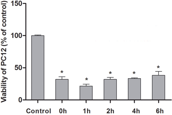 PC12, a set of cell lines isolated from adrenal medulla pheochromocytoma of rat, is generally characterized by neuroendocrine cell and passage; thus, the differentiated PC12 can be used as in-vitro cell model to investigate the physiological and biochemical functions of neuronal cells [4]. It has been reported that oxygen-glucose-serum deprivation/restoration (OGSD/R) can induce the apoptosis of spinal cord astrocytes through activating the endoplasmic reticulum to stress relevant apoptosis pathway [5]. In this process, the related apoptosis protein in endoplasmic reticulum (caspase-12) is activated, further causing apoptosis via a series of cascade reactions [5]. Procaspase-3 represents a common apoptosis-related protein, OGSD/R can also induce up-regulation of caspase in PC12 cells [6]. It had been reported that OGD/R could induce PC12 apoptosis varies from 2-24h [7–11]. There was no conclusion on this issue.