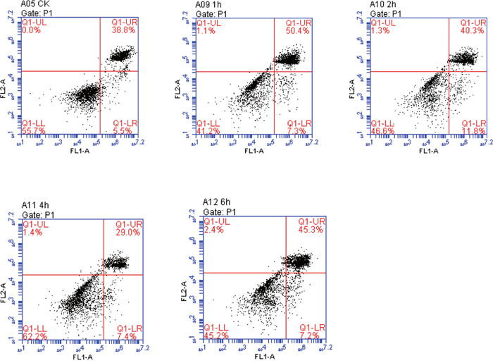 The flow cytometry method, which could make rapid, accurate, and quantitative analysis of apoptosis, was applied to examine the situation of apoptosis and to calculate the percentage of apoptosis at different time points. The results showed that the total apoptosis rate at 1h of OGSR was apparently higher than that at other time points and the differences were statistically significant (P<0.05), which was consistent with the observed results of cell morphology and detected results of cell activity (Table 1 and Figure 3).