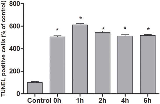 According to the TUNEL assay, the apoptosis of cells at different time points after OGSR was estimated. As shown in Figure 4, the increased DNA fragmentation was observed in the groups received OGSR compared with the control group (P<0.05). In addition, the TUNEL positive cells at 1h of OGSR was significantly higher than that at other time points (P<0.05). These results were in accordance with the results of flow cytometry examination and cell activity assay.
