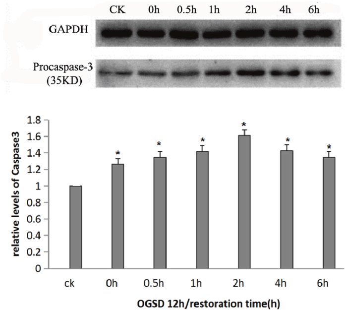 Figure 6: Procaspase-3 protein expression at different time points. Procaspase-3 content was increased at each time point after OGSR compared with control group (P<0.05), and was significantly higher at OGSD 12h/2h than that in the other groups (P<0.05).