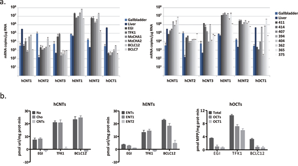 Figure 1: Cholangiocarcinoma drug transporters characterization. (A) mRNA expression of hNTs and hOCT1 in 6 cholangiocarcinoma derived cell lines (left) and 8 tumor samples (right). Four gallbladder (light blue) and one liver (dark blue) tissues were assessed as a reference. (B) Transport activity was determined in EGI-1, TFK-1 and BCLC12 cell lines. hCNTs (left) sodium-dependent uptake of [3H]uridine (light gray) was determined as uptake in NaCl medium (black) minus uptake in choline chloride (gray). hENTs (middle) uptake of [3H]uridine was determined as total uptake in choline chloride (black) minus uptake inhibited by 1μM NBTI for the hENT1 (gray) or 10μM dipyridamole for the hENT2 (light gray). hOCTs (right) uptake of [3H]MPP was determined as total uptake (black) minus uptake inhibited by 100μM d22 (gray) or 100μM quinidine (light gray) for the hOCT1. Results are mean ± S.E.M. (n=3).